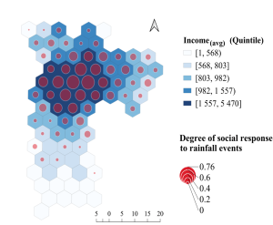 Figure 1 shows a map of São Paulo with a grid of hexagons that are coloured in blue shades according to the average household income of the corresponding area of the city. This is a traditional way of mapping urban inequalities, from which we can see that São Paulo has a strongly segregated radial pattern, with wealthier areas (dark shades) concentrated in the city centre, and areas of lower household income (lighter shades) towards the periphery. The overlay red bubbles depict the level of association we calculated between the volume of rain-related messages in Twitter/X and the measures of the rainfall radar: the bigger the bubble, the higher the coincidence of social media activity with actual rainfall (as estimated by the radar). Clearly, social media captured rainfall episodes fairly well — but only in the central, wealthier areas of the city. For the most impoverished neighbourhoods of São Paulo towards the city edges, there is scant correlation between rain-related social media activity and actual rain.
